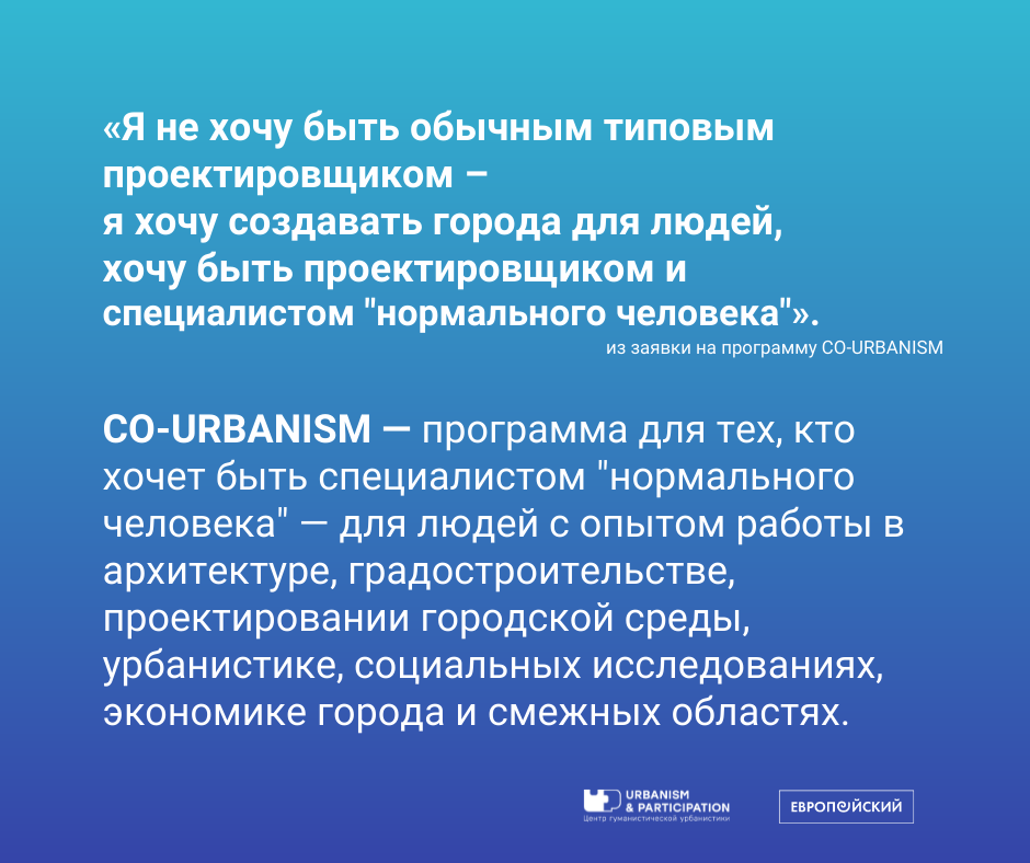 Программа CO-URBANISM — это уникальный курс по урбанистике от Европейского университета, который учит работать над городской средой в междисциплинарных командах и применять инструменты соучастия.